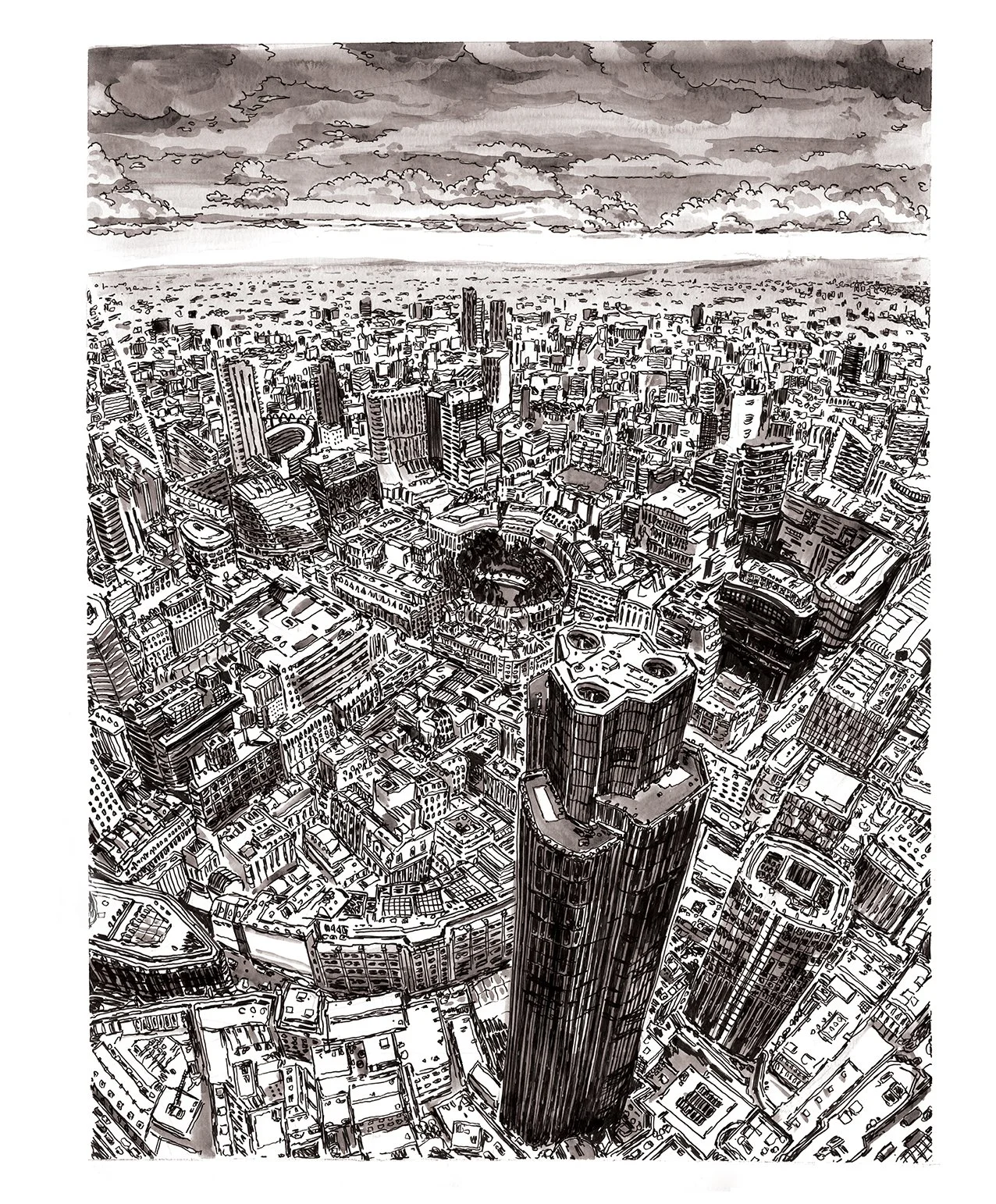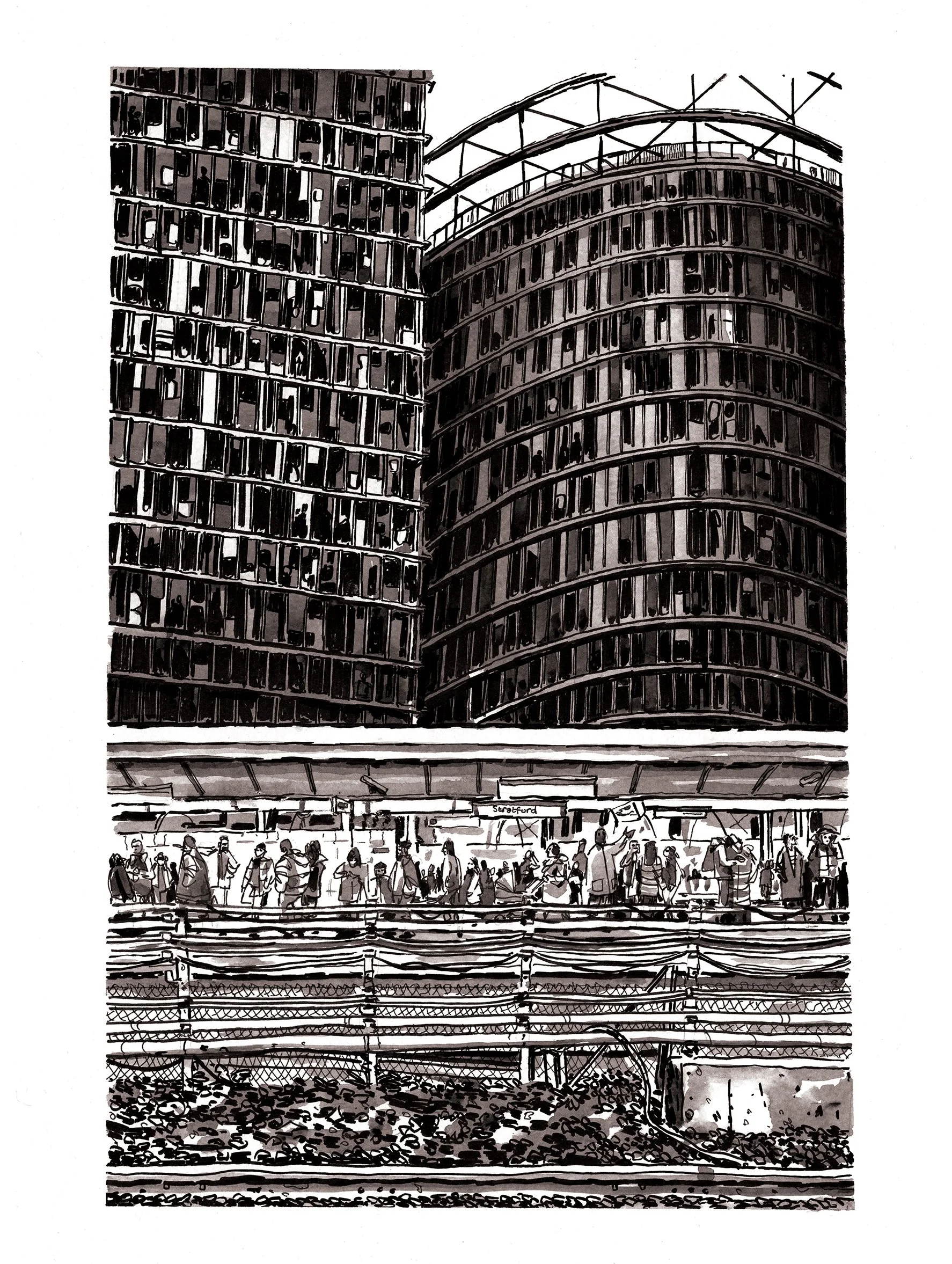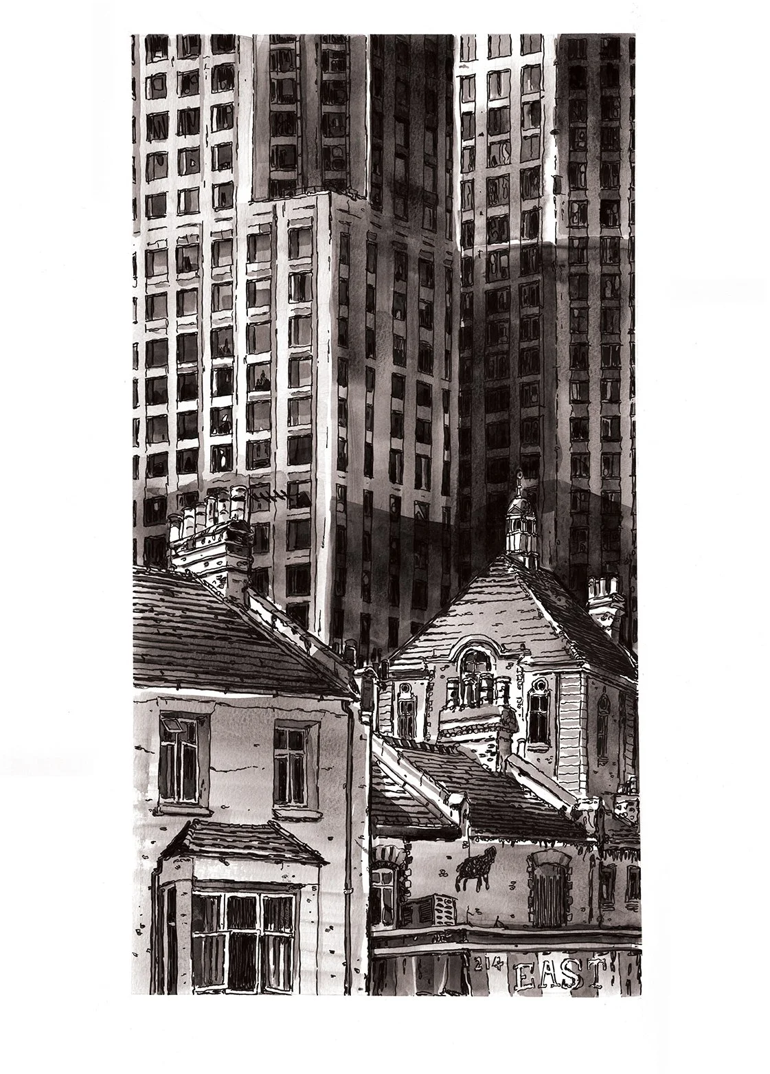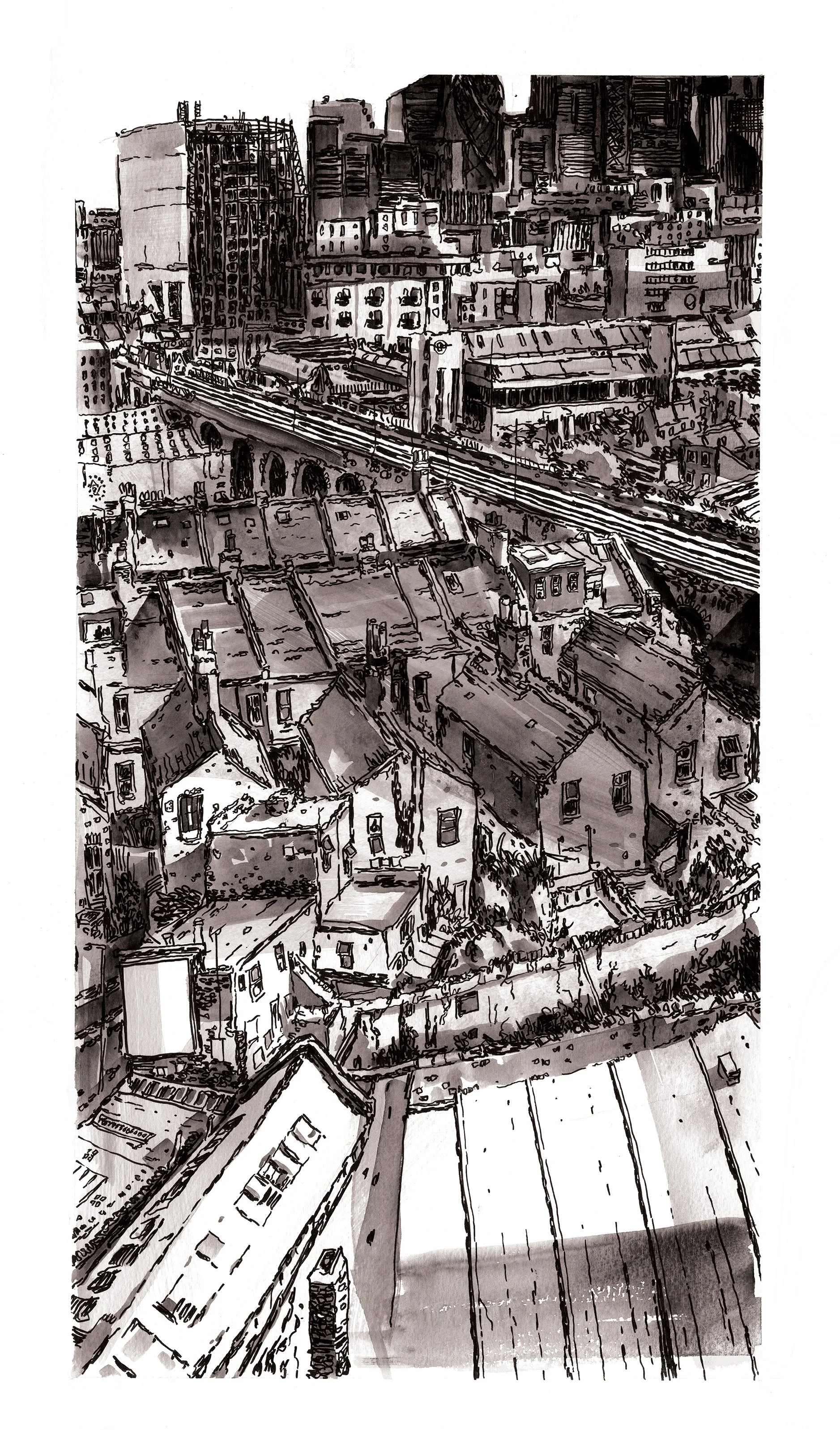 A selection of illustrations based around the theme of scale. Most drawings are created with ink, and a mixture of acrylic ink, watercolour and gouache paint.
